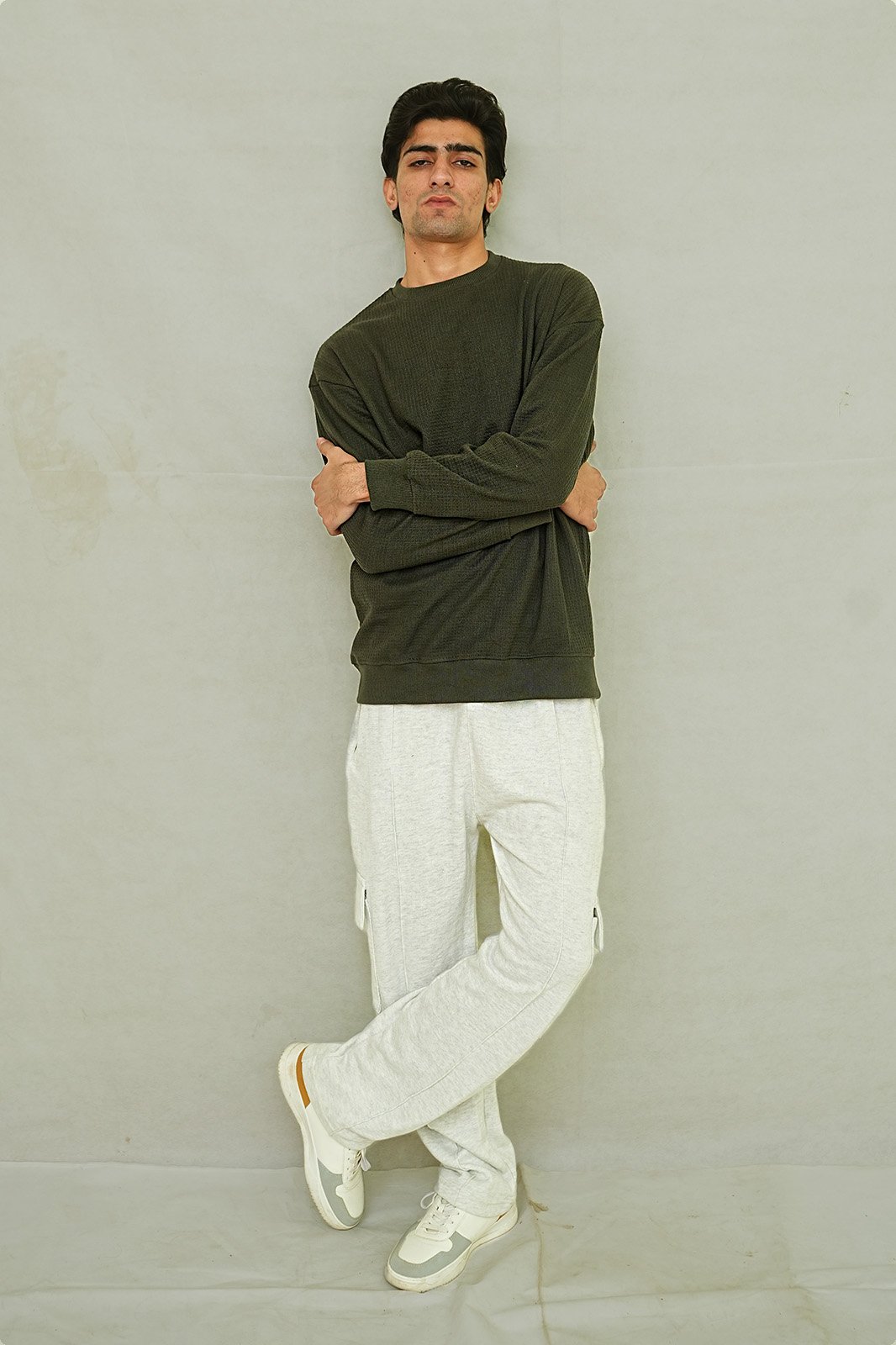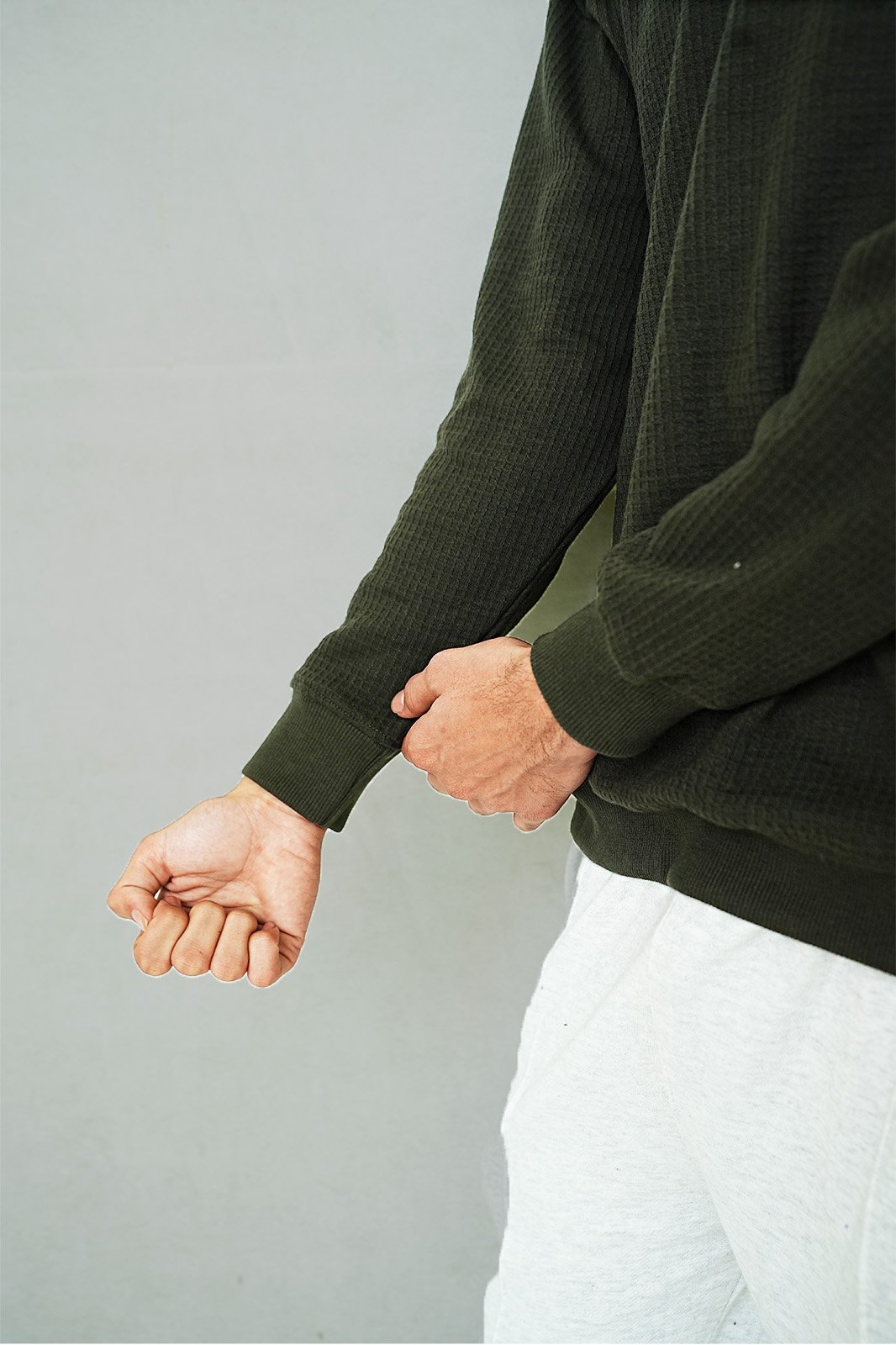 The Poshaq Drop-Shoulder Textured T-Shirt in Olive Green brings comfort, style, and premium quality together. Made from a soft, breathable waffle-knit cotton blend.