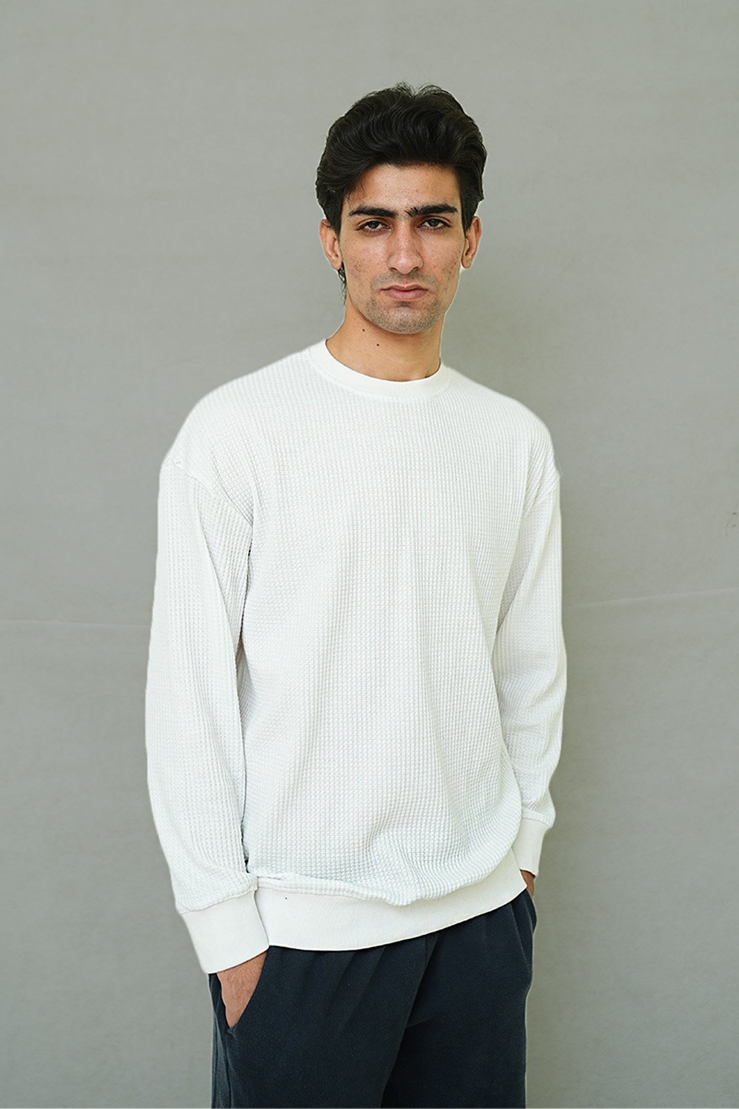 Experience comfort with a modern edge. The Poshaq Drop-Shoulder Textured T-Shirt is crafted from a premium waffle-knit cotton blend that feels soft, breathable, and perfect for everyday wear.